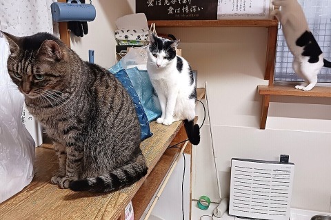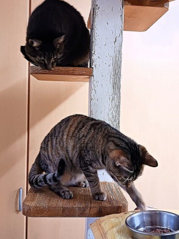 でも私が離れると、ゆうひちゃん(右)も子猫用のご飯が好きなので、結局しらたまちゃんは追い払われてしまいました。