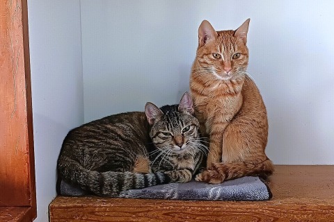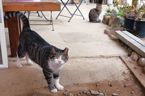 ・・・外猫の気の強いしまちゃん(左)と、奥さんのランちゃん(右奥)は、仲よく日向ぼっこできそうで良かったです。